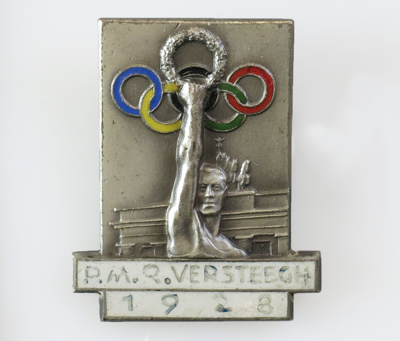 Deze zilverkleurige speld is vervaardigd voor dressuurruiter Pierre Marie Robert Versteegh (1888-1942), die tijdens de Olympische Spelen van 1928 te Amsterdam als lid van het Nederlandse dressuurteam een bronzen medaille won. De speld, uitgevoerd met gekleurde olympische ringen in emaille, werd echter pas in 1936 aan hem uitgereikt. Naast het wedstrijdrijden schopte Versteegh het als militair tot luitenant-kolonel der artillerie. Hij bekleedde deze functie toen het Duitse leger op 10 mei 1940 Nederland binnenviel. Mede vanwege zijn Joodse vrouw nam hij al snel ontslag uit de dienst. Vervolgens sloot hij zich aan bij de Ordedienst (OD), een paramilitaire organisatie waarmee Versteegh zich wilde verzetten tegen de Duitse bezetters. Hij heeft zijn plan echter nooit kunnen uitvoeren, daar hij werd gearresteerd en op 3 mei 1942 in concentratiekamp Sachsenhausen zijn einde vond. ( Sarah Remmerts de Vries)