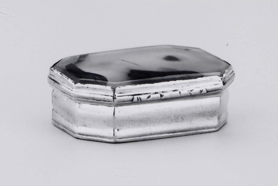 Agaat werd in de achttiende eeuw dikwijls voor deksels van zilveren dozen gebruikt. Men paste dit gepolijste kwartsgesteente in verschillende kleurschakeringen toe. Zie voor een zilveren snuifdoos met een deksel van agaat met een roodbruine tekening, in 1752 in Schoonhoven vervaardigd: Wttewaall 1994~2, p. 268 afb. 832. De contrastrijke combinatie van zilver en agaat was ook in de negentiende eeuw geliefd, getuige het voyante twintigdelige dienbestek dat Jacob Hendrik Schouten in 1856 vervaardigde (cat.nr. KA 19420). Zie het commentaar bij cat.nr. KA 3805. ( Bert Vreeken)
