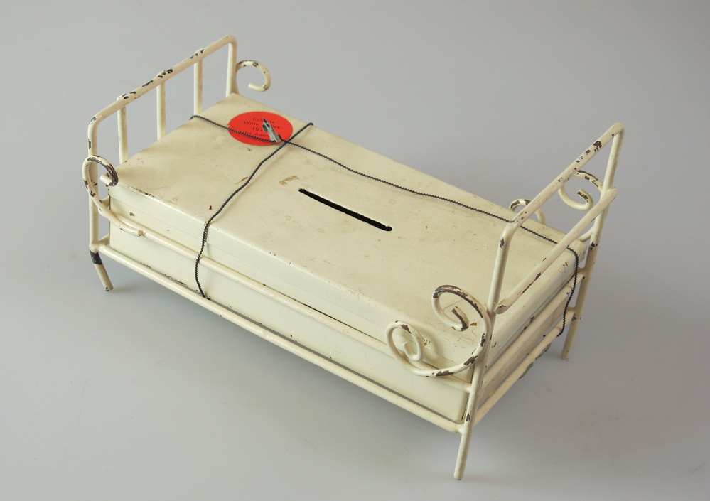 De Witte Bedjes-actie is begonnen in 1946, op initiatief van journalist Henri Knap. Knap zette via zijn dagelijkse rubriek ‘Amsterdams dagboek’ in het Parool een inzamelingsactie op touw, om kinderen in ziekenhuizen sinterklaascadeautjes te geven. Het werd een succes en Knap besloot het in de jaren erna te blijven organiseren. De actie kreeg zoveel bekendheid dat artiesten als Willy Alberti en André van Duin hun naam eraan verbonden, door op te treden tijdens ‘De nacht van de witte bedjes’ in de City Bioscoop te Amsterdam. In 1967 werd Stichting Witte Bedjes Het Parool opgericht en het doel verbreed. Naast sinterklaascadeautjes ging de stichting zich ook bezighouden met de organisatie van kleinschalige projecten voor zieke en gehandicapte kinderen. Deze bijzondere collectepot in de vorm van een ziekenhuisbed is gebruikt om geld op te halen voor de stichting. Het collecteren werd niet alleen door vrijwilligers gedaan, maar soms ook door bekende mannequins in het uitgaansleven. ( Sarah Remmerts de Vries)