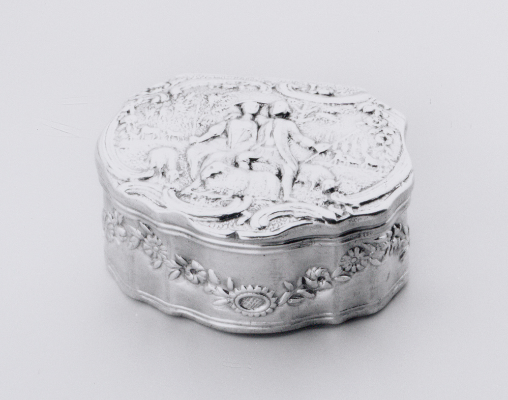 Cartouchevormige doos met gecontourneerde wand, rechte achterzijde en scharnierend deksel met duimstuk. Profielrand langs onderrand doos en deksel. Reliëfdecors, op deksel en bodem op een geruwde ondergrond tussen C- en S-voluten. Op deksel een voorstelling van een herderspaar met schaapskudde in een landschap. Wand met een bloemguirlande. Op bodem een voorstelling van Tobias en de aartsengel Rafaël (apocrief boek Tobit).