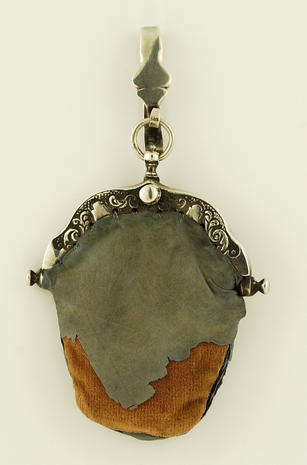 Het langwerpige beursje is vastgenaaid aan de beugel. Het tasje is een blauw/groen monochroom gekleurd en gevoerd zijden weefsel. Eronder is gedeeltelijk het oorspronkelijke oranje fluwelen tasje te zien. Het zijden tasje is er later overheen gezet.