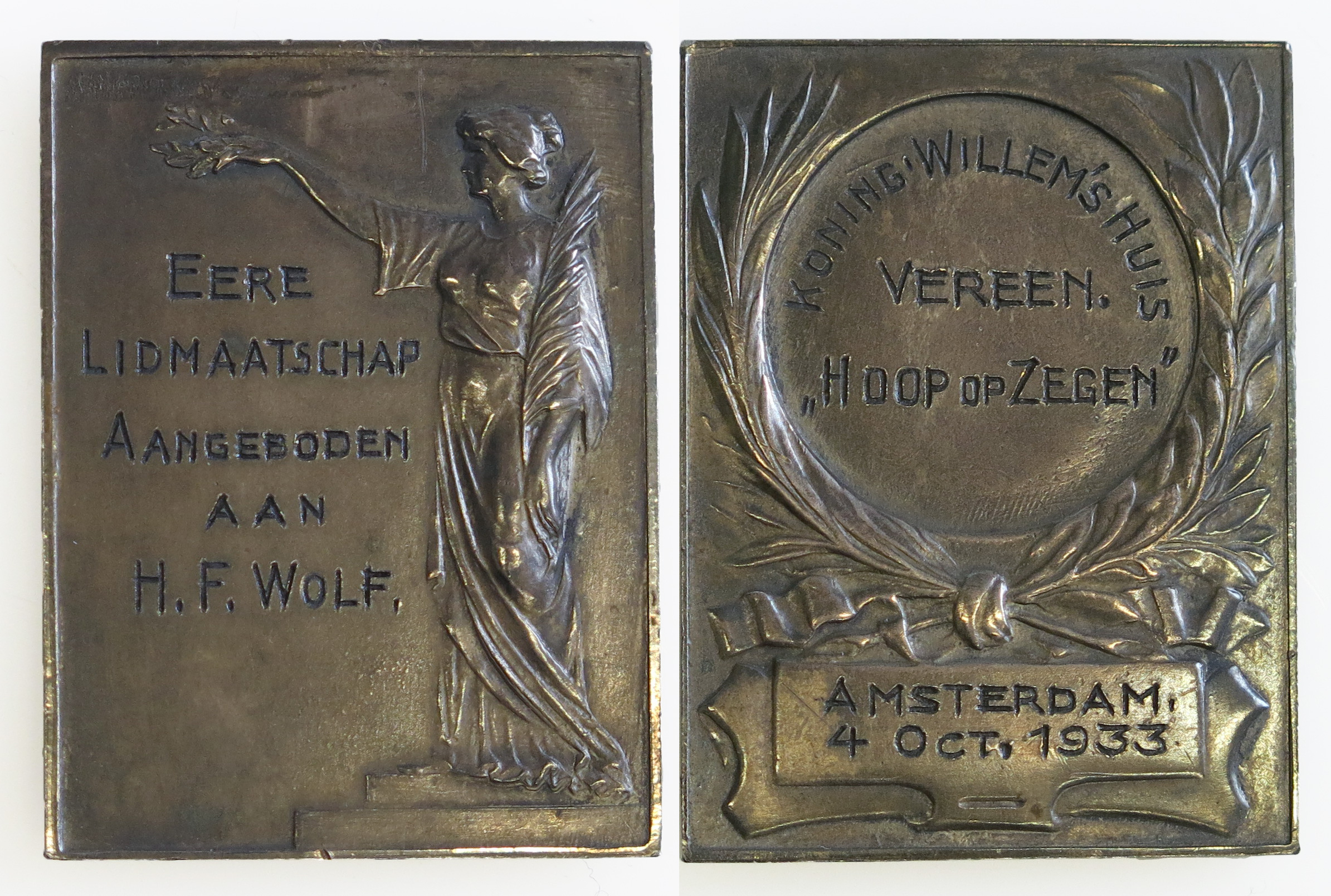 opschrift keerzijde: KONING WILLEM'S HUIS / VEREEN. / "HOOP OP ZEGEN"