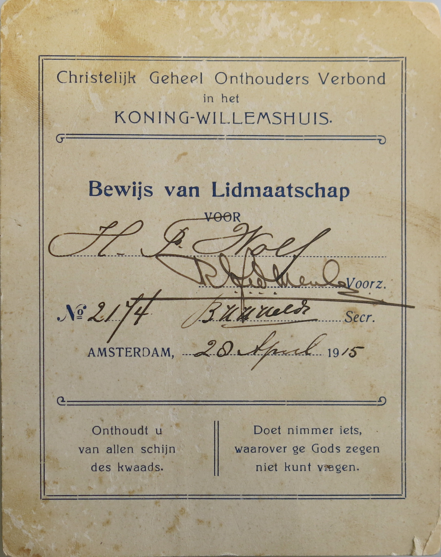 Lidmaatschapskaart uit 1915 van het Christelijk Geheelonthouders Verbond, dat was gevestigd in het Koning Willemshuis aan de Egelantierrstraat. Oprichter in 1862 én allereerste pleitbezorger voor geheelonthouding in ons land was de charismatische dominee Carel Steven Adama van Scheltema (1815-1897). Van hem heeft het Amsterdam Museum ook een portret in de collectie.