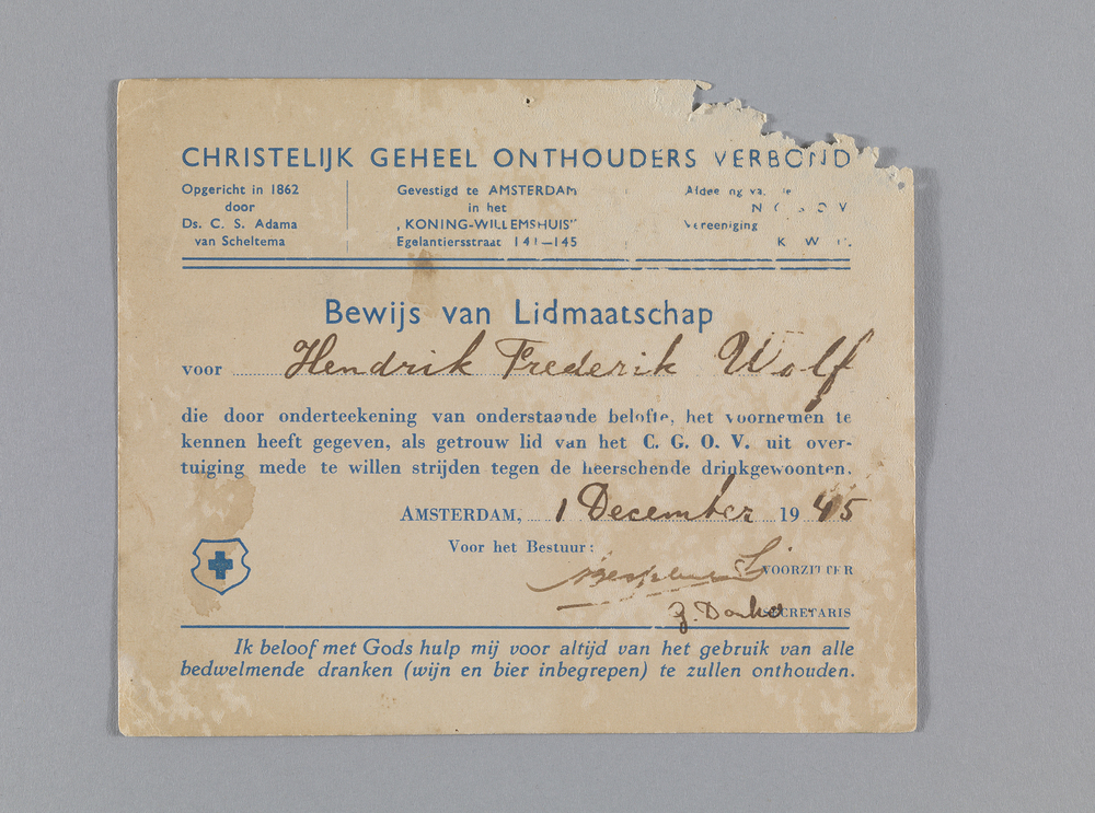 Lidmaatschapskaart uit 1945 van het Christelijk Geheelonthouders Verbond, dat was gevestigd in het Koning Willemshuis aan de Egelantierrstraat. Oprichter in 1862 én allereerste pleitbezorger voor geheelonthouding in ons land was de charismatische dominee Carel Steven Adama van Scheltema (1815-1897). Van hem heeft het Amsterdam Museum ook een portret in de collectie.