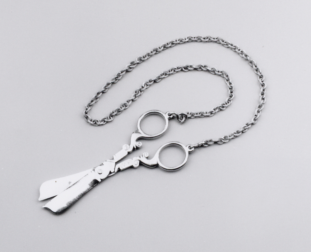 Scharnierscharen als deze werden in de achttiende eeuw bij het handwerken gebruikt. De ketting diende ter bevestiging aan een gordel of tuigje. Bijzonder aan dit exemplaar is dat de bladen van zilver zijn in plaats van staal. Zie over scharen: Wttewaall 1994~2, p. 120-127. ( Bert Vreeken)