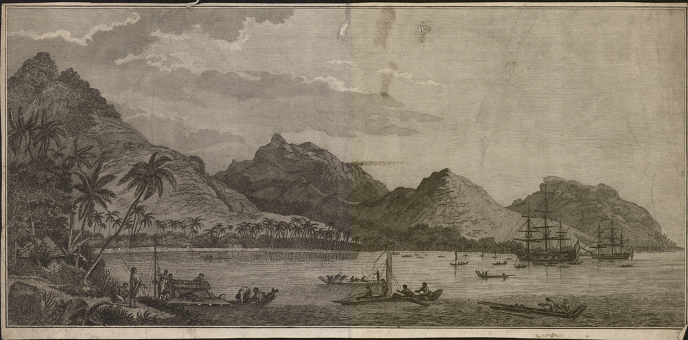 Baai met handelsschepen en kleinere bootjes van inlanders- Trefwoorden