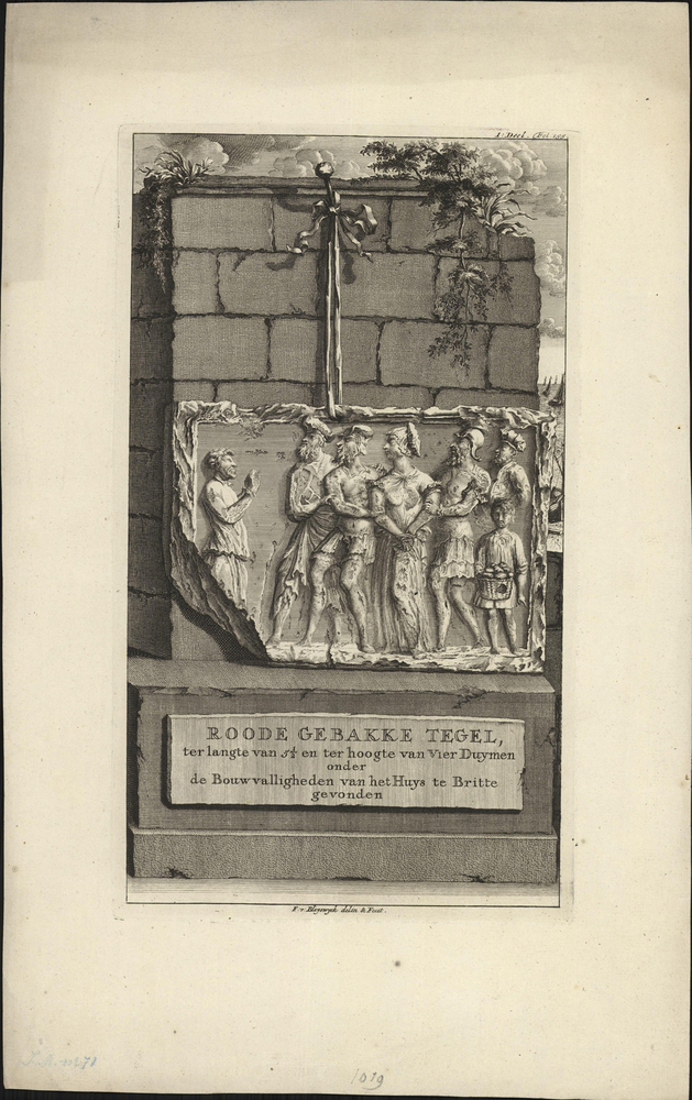 opschrift midden onder in afbeelding: ROODE GEBAKKE TEGEL, / ter langte van 5 1/2 en ter hoogte van Vier Duymen / onder / de Bouwvalligheden van het Huys te Britte / gevonden