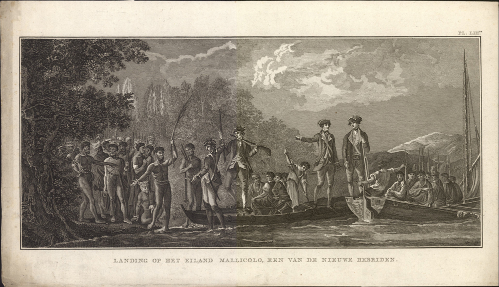 titel midden onder de afbeelding: Landing op het eiland Mallicolo, een van de Nieuwe Hebriden