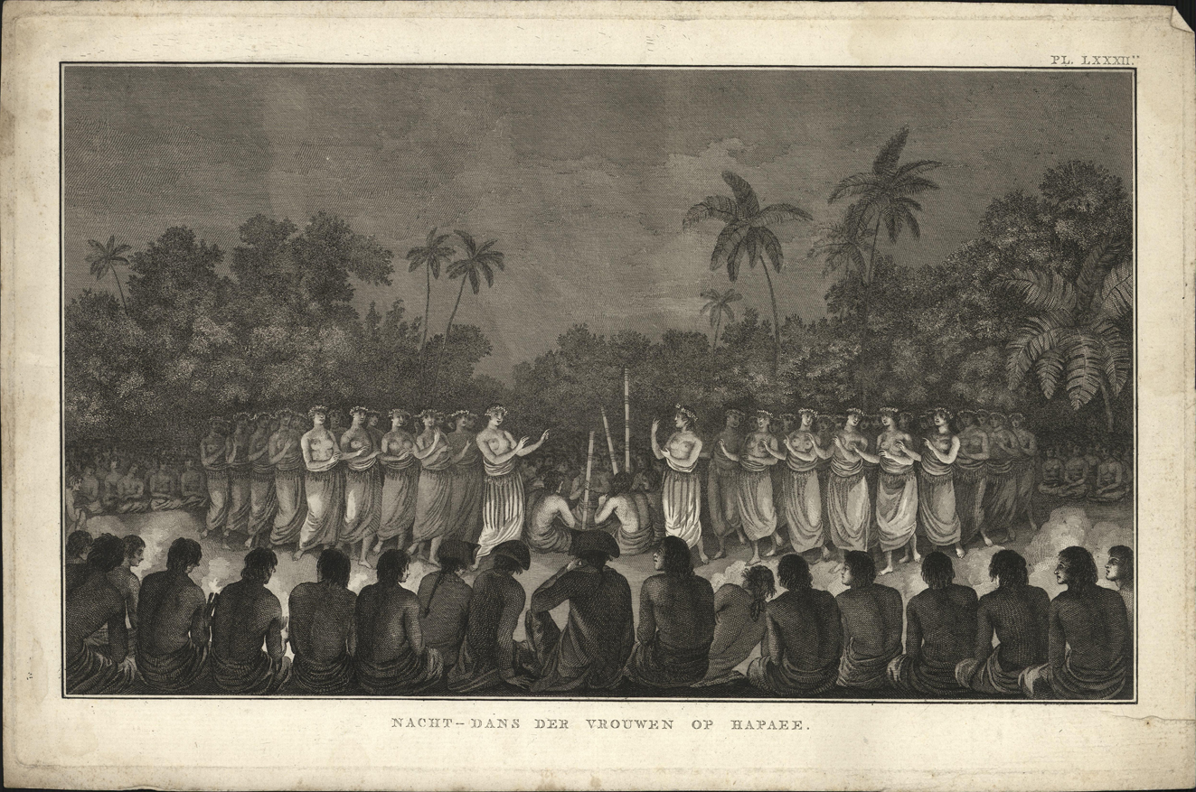 titel midden onder de afbeelding: Nacht-dans der vrouwen op Hapaee