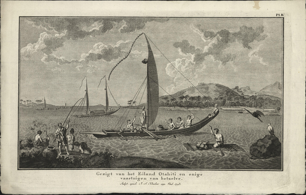 titel midden onder de afbeelding: Gezigt van het Eiland Otahiti en enige vaartuigen van hetzelve