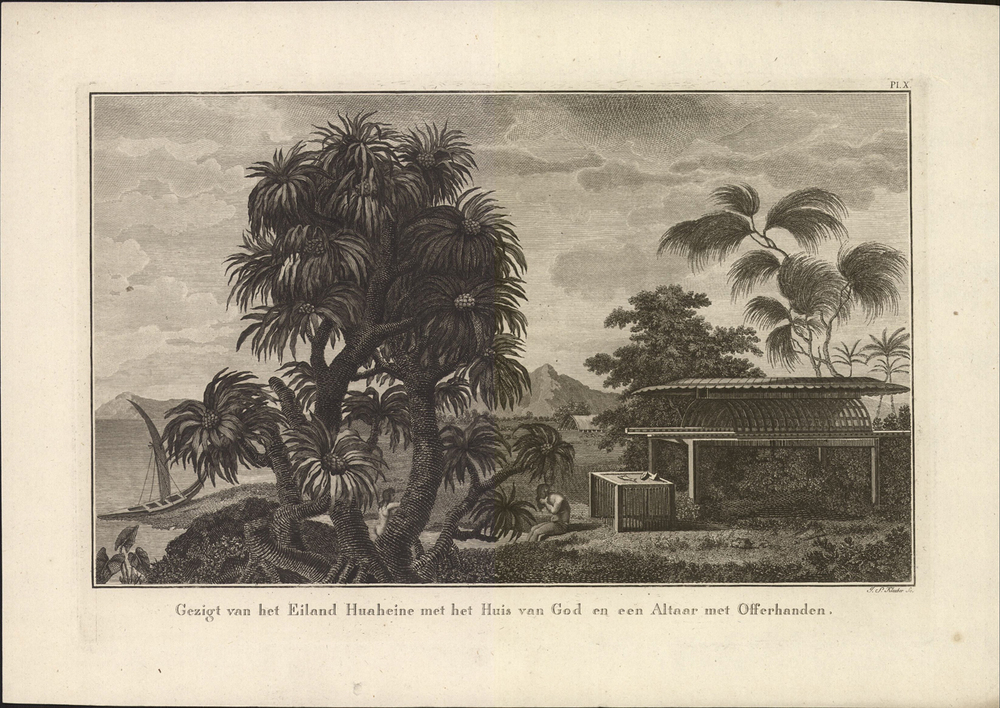 titel midden onder de afbeelding: Gezigt van het Eiland Huaheine met het Huis van God en een Altaer met offerhanden