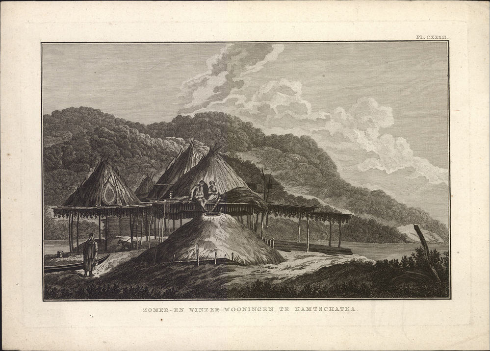 titel midden onder de afbeelding: Zomer en winter - wooningen te Kamtschatka