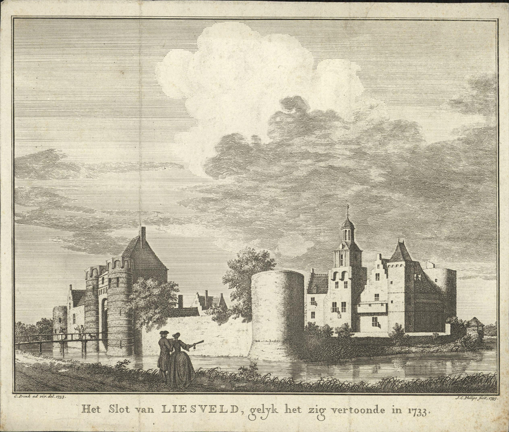 - opschrift onder in de marge: Het Slot van LIESVELD, gelyk het zig vertoonde in 1733.