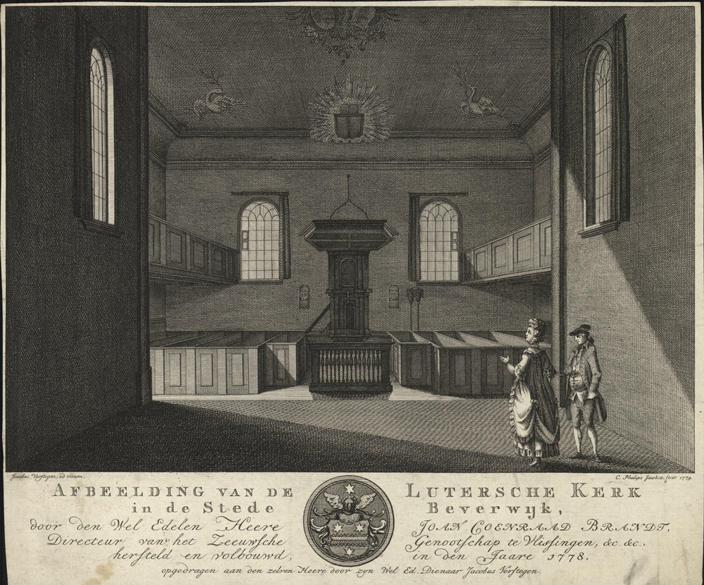 opschrift Onder afbeelding in de marge: AFBEELDING VAN DE LUTERSCHE KERK / in de Stede Beverwijk, / door den Wel Edelen Heere JOAN COENRAAD BRANDT, / Directeur van het Zeeuwsche Genootschap te Vlissingen, &c. &c. / hersteld en volbouwd, in den Jaare 1778 / opgedragen aan den zelven Heere door zijn Wel Ed. Dienaar Jacobus Verstegen.