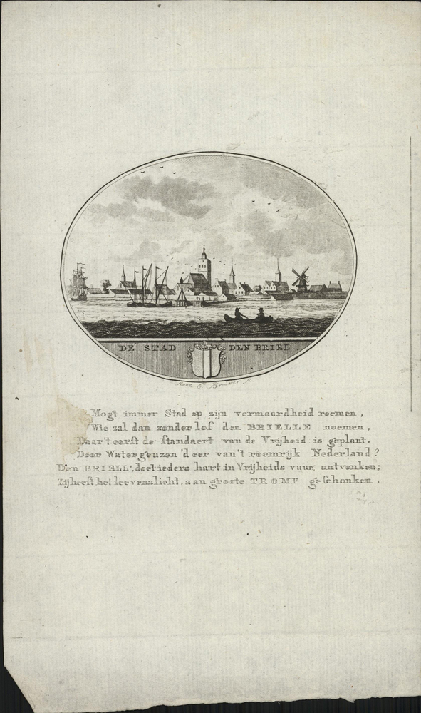 opschrift midden onder: Mogt immer Stad op zijn vermaardheid roemen,/ Wie zal dan zonder lof den BRIELLE noemen,/ Daar't eerst de standaert van de Vrijheid is geplant,/ Daar Watergeuzen 'd eer van 't roemrijk Nederland?/ Den BRIELL', doet ieders hart in Vrijheidsvuur ontvonken;/ Zij heeft het levenslicht aan groote TROMP geschonken.