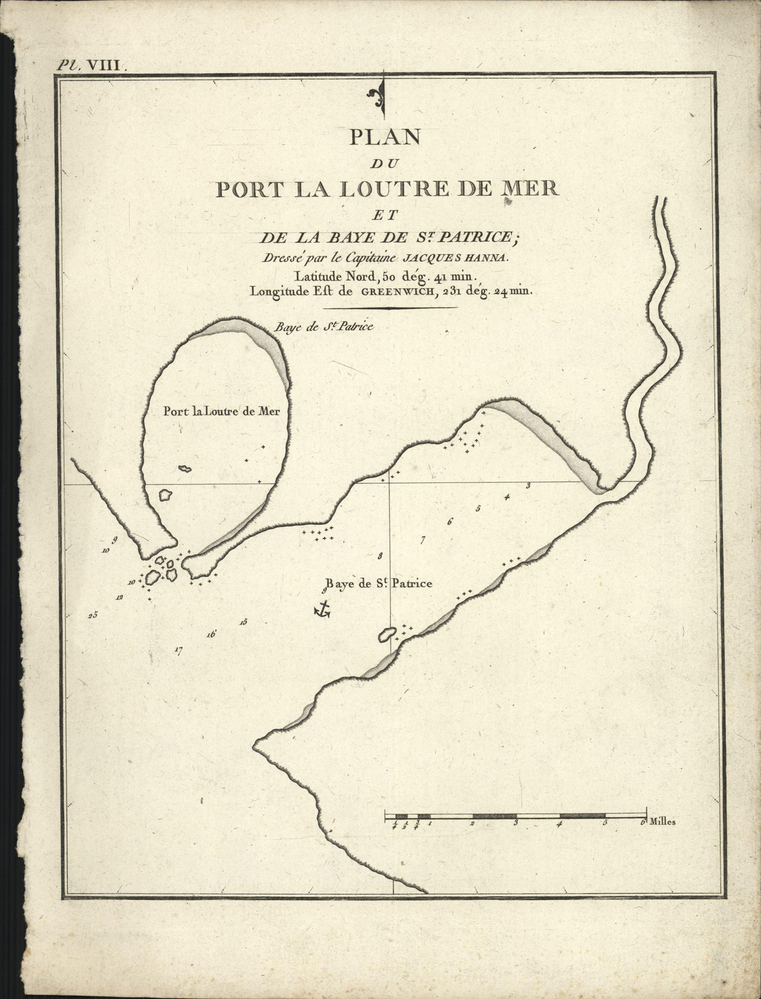 - opschrift midden boven in afbeelding: PLAN / DU PORT LA LOUTRE DE MER / ET / DE LA BAYE DE ST. PATRICE; / Dressé par le Capitaine JACQUES HANNA. / Latitude Nord, 50 deg. 41 min. / Longitude Est de GREENWICH, 231 deg. 24 min.