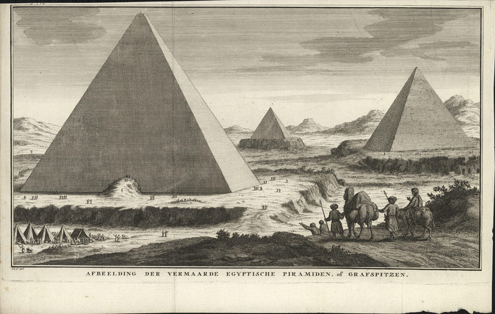 - opschrift midden onder in marge: AFBEELDING DER VERMAARDE EGYPTISCHE PIRAMIDEN, of GRAFSPITZEN.