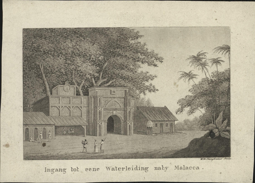 - opschrift midden onder in de marge: Ingang tot eene Waterleiding naby Malacca.