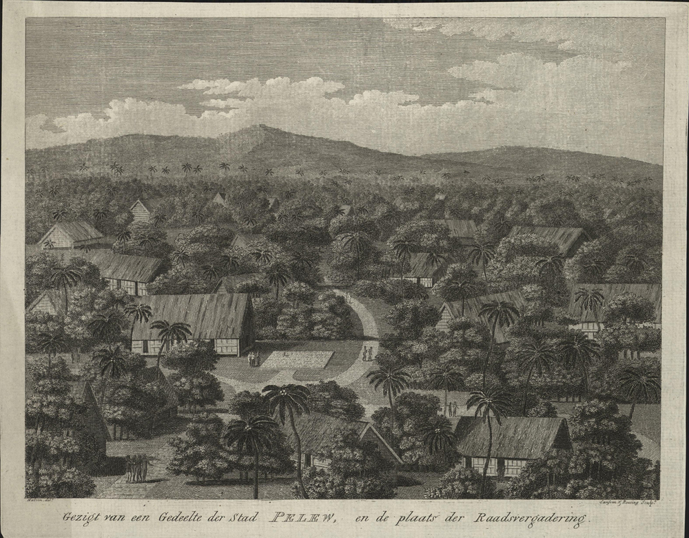 opschrift midden onder afbeelding: Gezicht van een Gedeelte der Stad Pelew, en de plaats der Raadsvergadering - aangetroffen 1985-02