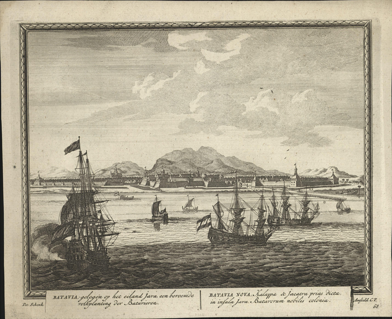 opschrift links onder de afbeelding: BATAVIA; gelegen op het eiland Java, een beroemde volkplanting der Batavieren.