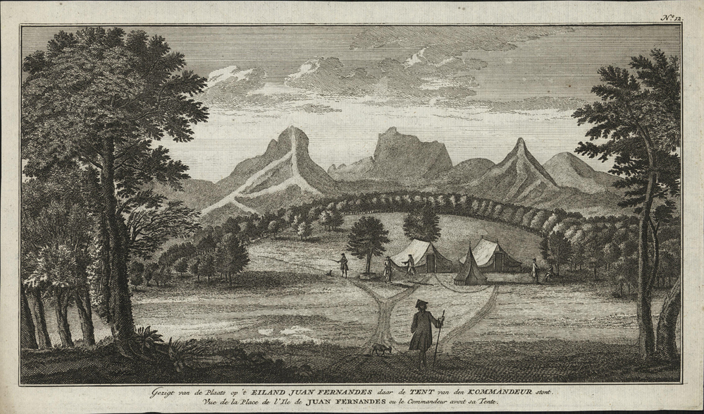 titel midden onder de afbeelding: Gezigt op de Plaats op 't Eiland Juan Fernandes daar de tent van den Kommandeur stont.