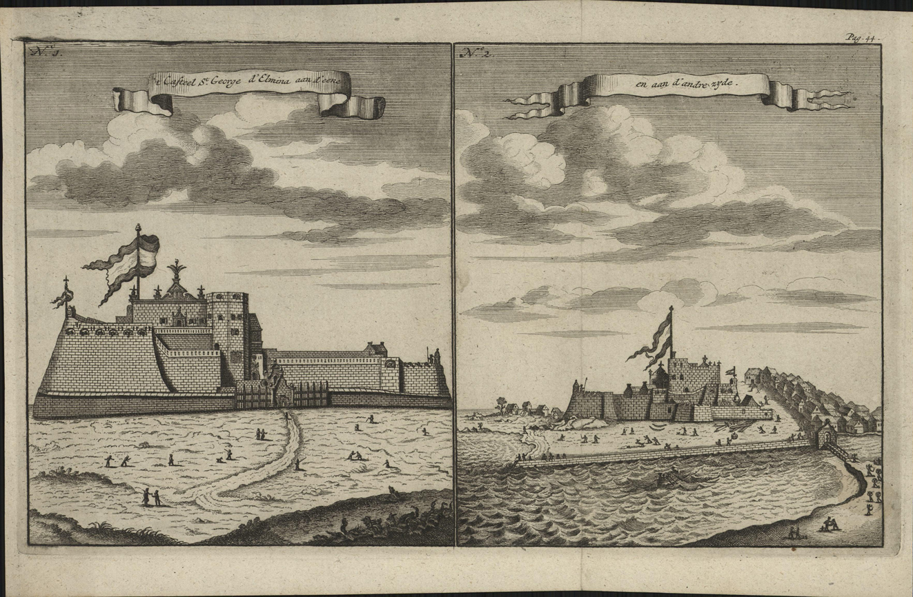 opschrift links bovenin de eerste afbeelding in de banner: 't Casteel St. George d'Elmina aan d'eene