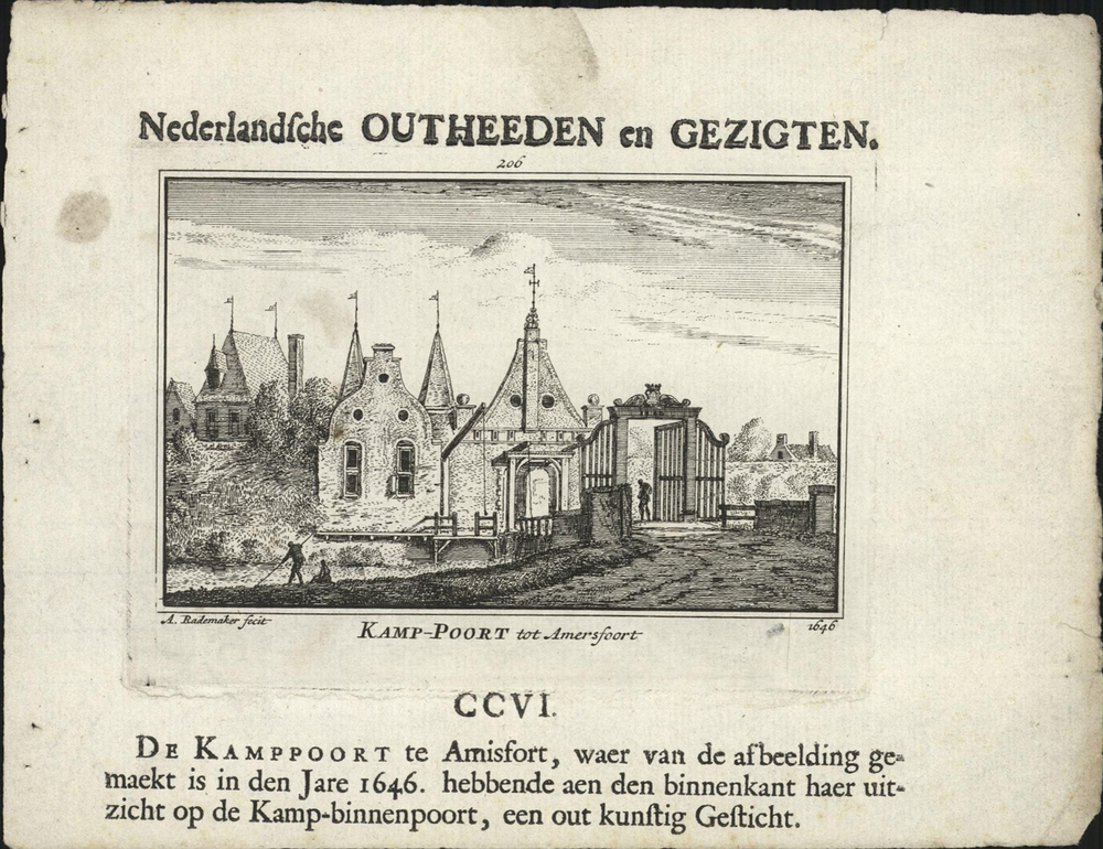 opschrift midden onder de afbeelding: CCVI./ DE KAMPPOORT te Amisfort, waer van de afbeelding ge-/ maekt is in den Jare 1646. hebbende aen den binnenkant haer uit-/ zicht op de Kamp-binnenpoort, een out kunstig Gesticht.