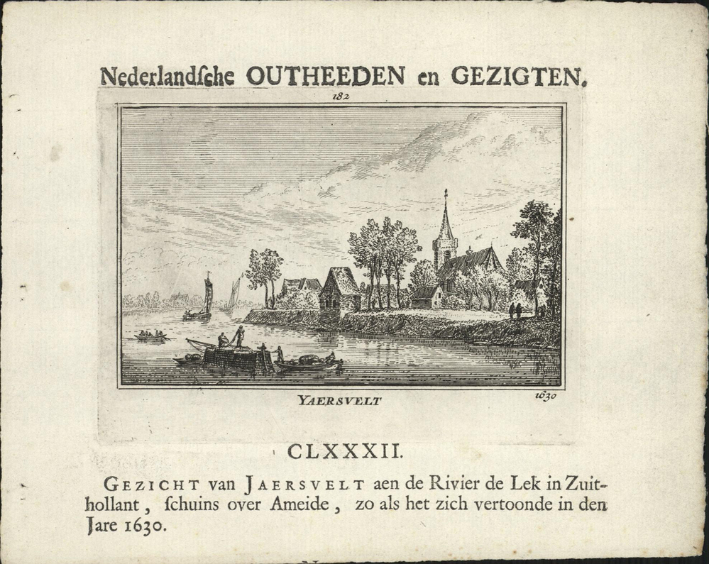opschrift midden onder in de marge: CLXXXII./ GEZICHT van JAERSVELT aen de Rivier de Lek in Zuit-/hollant, schuins over Ameide, zo als het zich vertoonde in den Jare 1630.