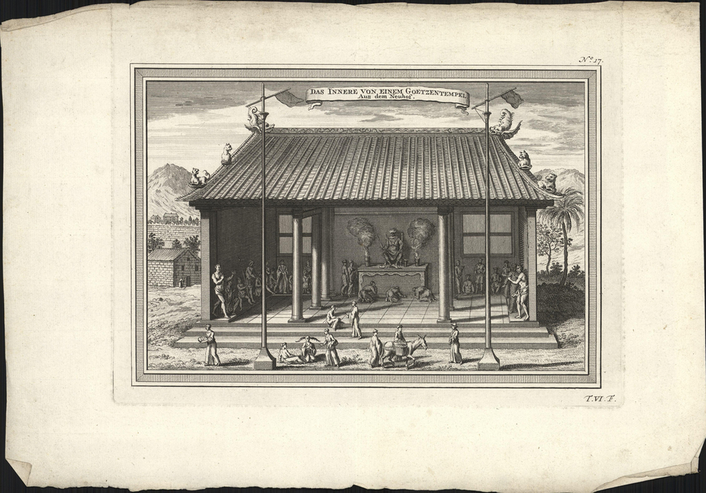 - opschrift midden boven in afbeelding: DAS INNERE VON EINEM GOETZENTEMPEL/ Aus dem Neuhof.