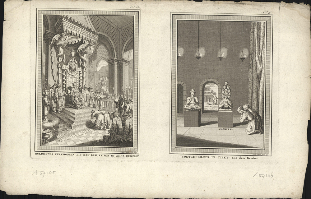 Twee prenten op 1 blad: Huldigingsceremonie van de keizer van China, en Godenbeelden in Tibet