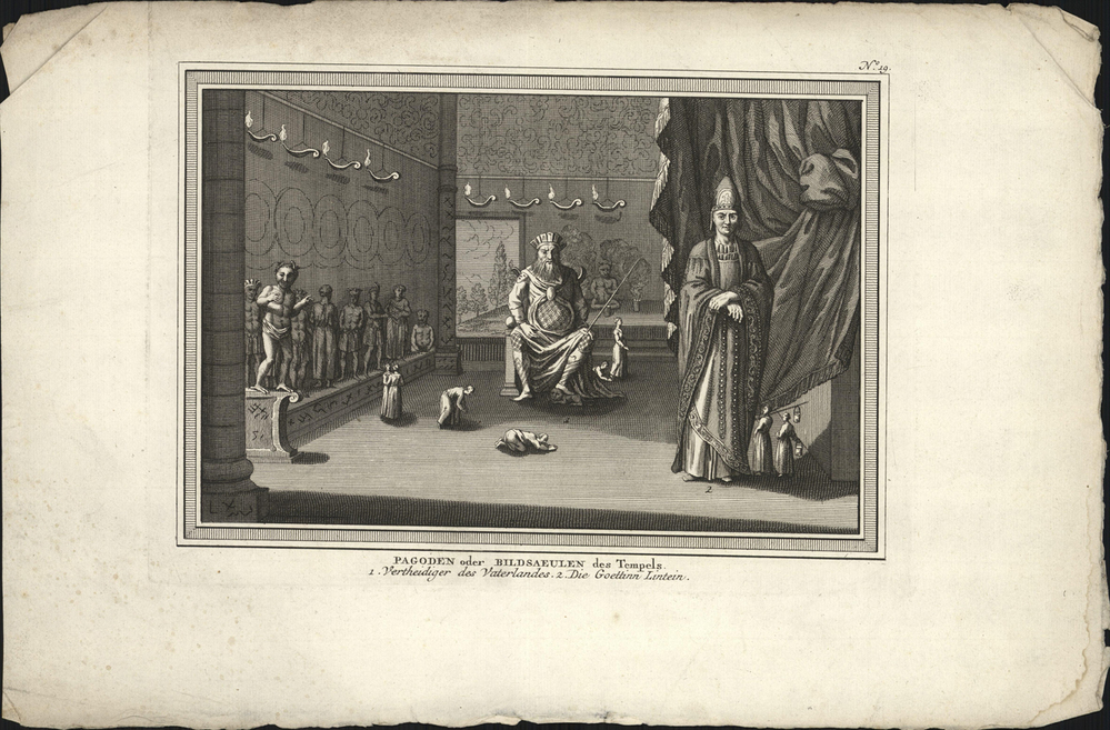 - opschrift midden onder in marge: PAGODEN oder BILDSAEULEN des Tempels./ 1. Vertheidiger des Vaterlandes. 2. Die Goettinn Lintein.