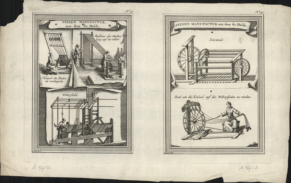 opschrift midden boven in afbeelding rechter prent: SEIDEN MANUFACTUR, aus dem du Halde.
