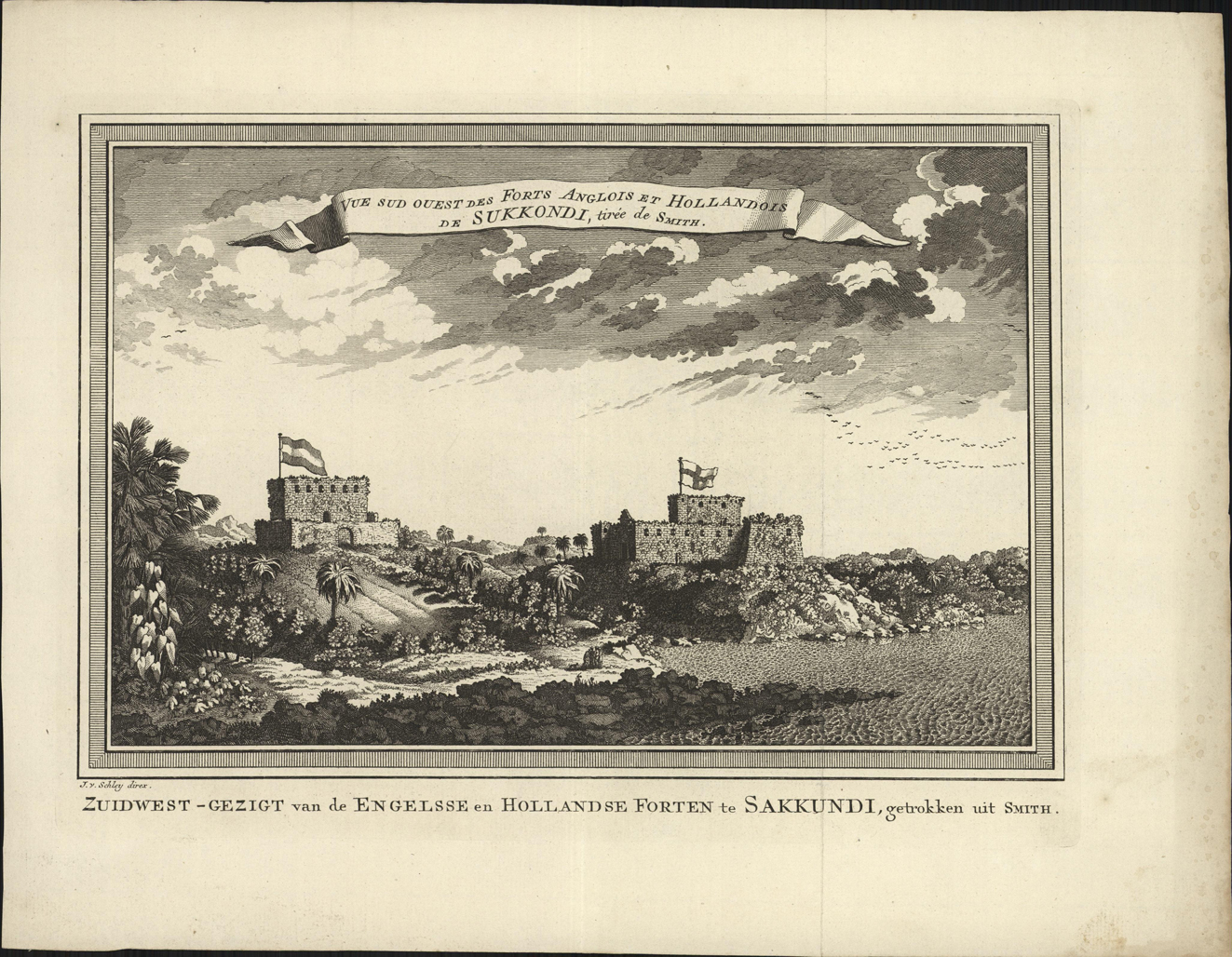 opschrift midden onder in marge: ZUIDWEST-GEZIGT van de ENGELSSE en HOLLANDSE FORTEN te SAKKUNDI, getrokken uit SMITH.