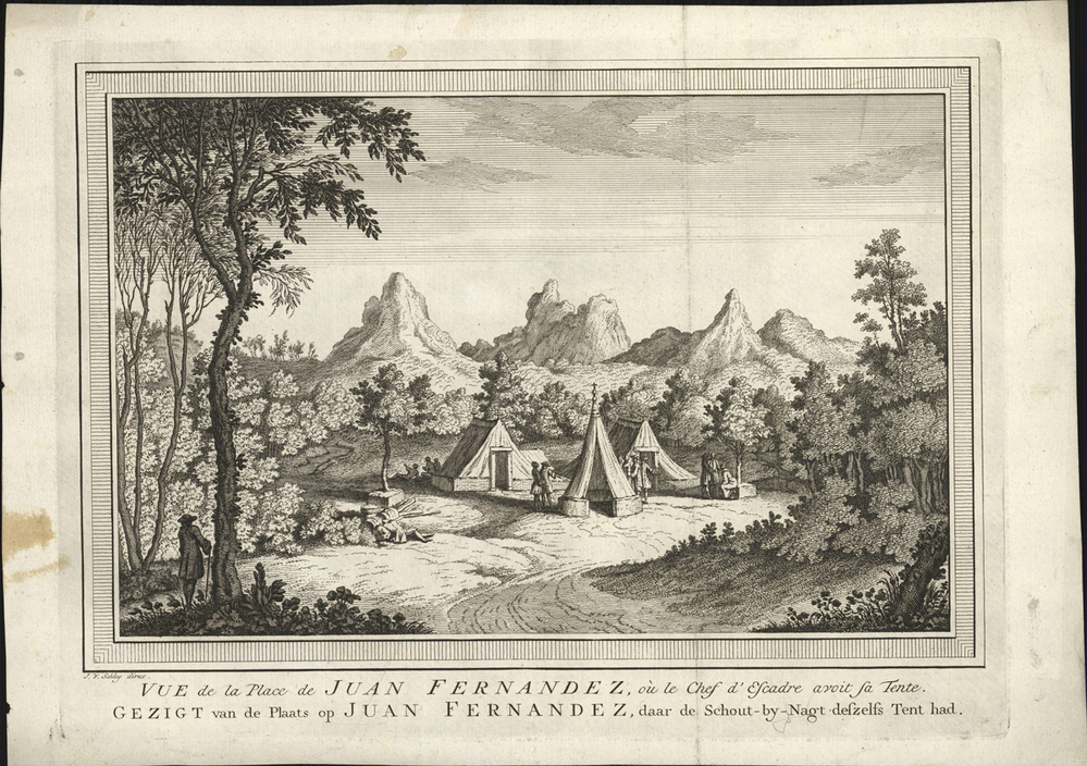 opschrift midden onder afbeelding: VUE de la Place de JUAN FERNANDEZ, où le Chef d'Escadre avoit sa Tente./ GEZIGT van de Plaats op JUAN FERNANDEZ, daar de Schout-by-Nagt deszelfs Tent had.