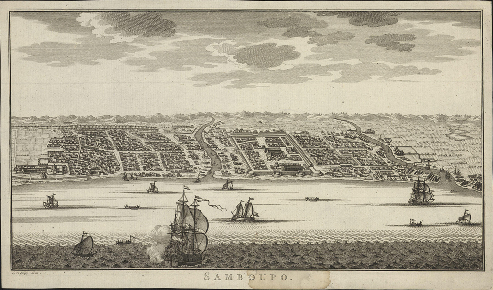 Vogelvluchtoverzicht van de stad Samboupo (Makassar op Sulawesi) met op de voorgrond handelsschepen.