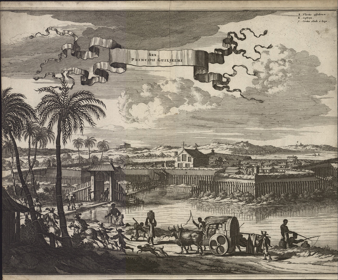 Het Hollandse fort William aan de Afogados rivier. Op de oever werklui en een kar- Trefwoorden