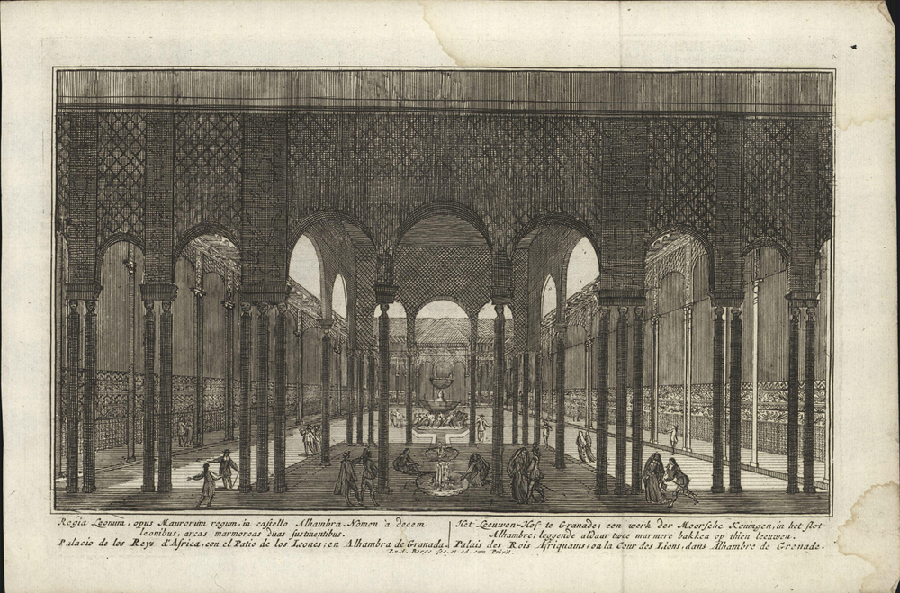 opschrift rechts onder afbeelding: Het Leeuwen-Hof te Granada; een werk der Moorsche Koningen, in het Slot/ Alhambre; leggende aldaar twee marmeren bakken op thien leewen./