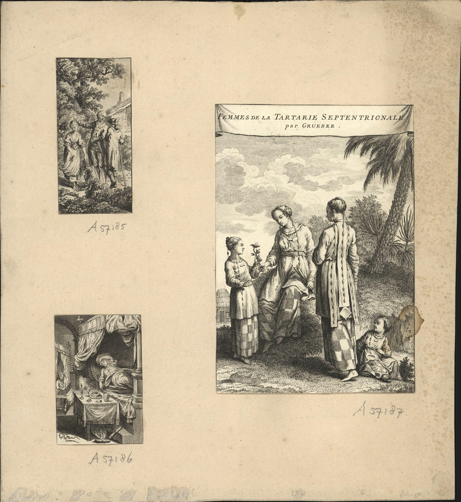 - opschrift midden boven in rechter prent: FEMMES DE LA TARTARIE SEPTENTRIONALE/ par GRUEBER.
