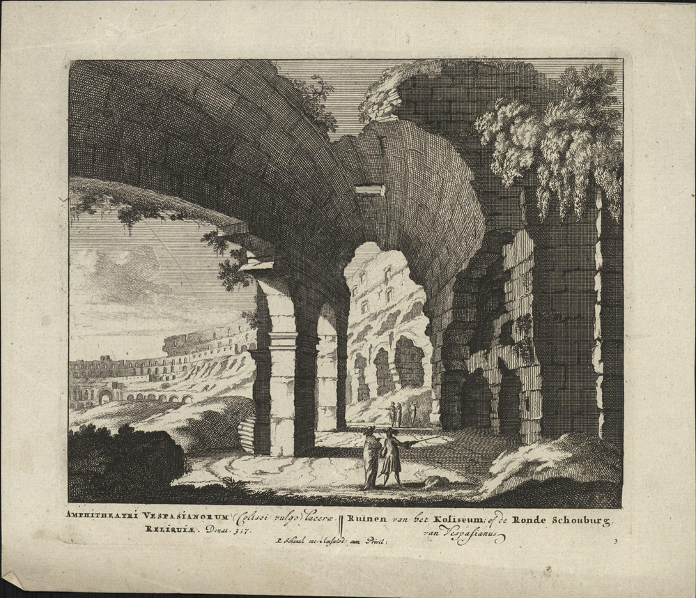 - opschrift onder in de marge: AMPHITEATRI VESPASIANORUM (Colisei vulgo) Lacera/ RELIQUIAE / Ruinen van het Koliseum; of de Ronde Schouburg van Vespasianus