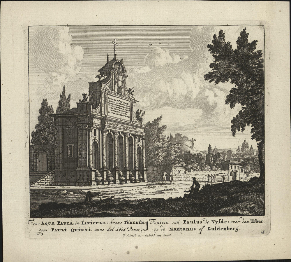 - opschrift onder in de marge: Fons AQUAE in IANICULO. trans TYBERIM;/ opus PAULI QUINTI, anno Sal. 1612. Donat 4:22 / FOntein van Paulus de Vyfde; over den Tiber./ op de Montonus of Guldenberg.