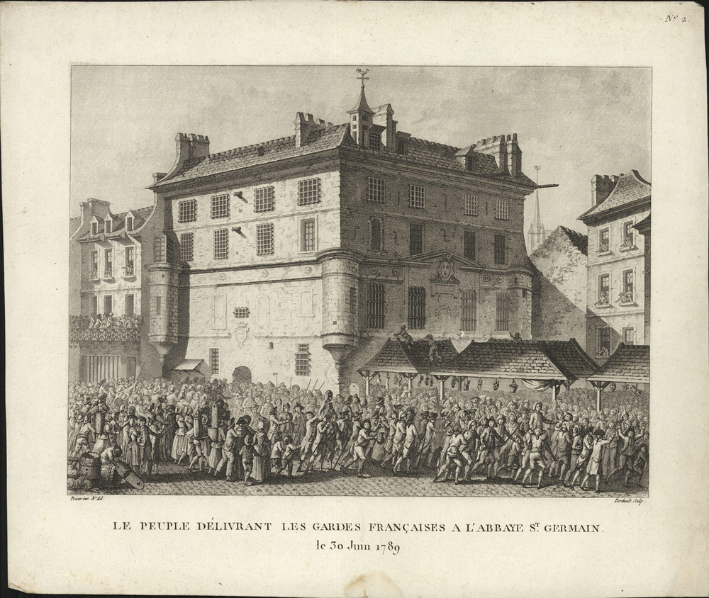 - opschrift midden onder afbeelding: LE PEUPLE DÉLIVRANT LES GARDES FRANÇAISES A L'ABBAYE ST. GERMAIN./ le 30 Juin 1789
