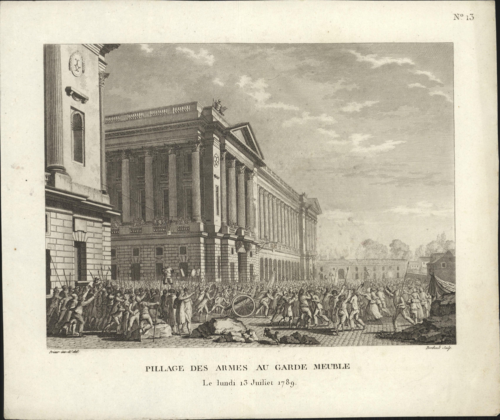 - opschrift midden onder afbeelding: PILLAGE DES ARMES AU GARDE MEUBLE./ Le lundi 13 Juilet 1789
