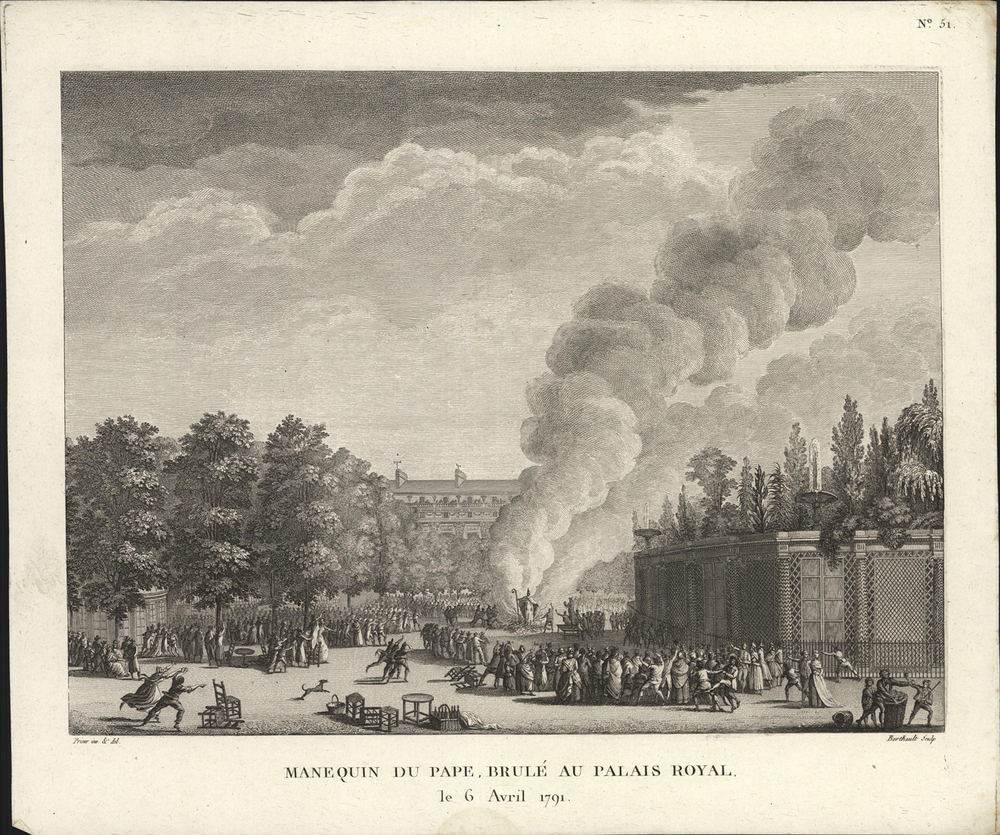 - opschrift midden onder afbeelding: MANEQUIN DU PAPE, BRULÉ AU PALAIS ROYAL. / le 6 Avril 1791.