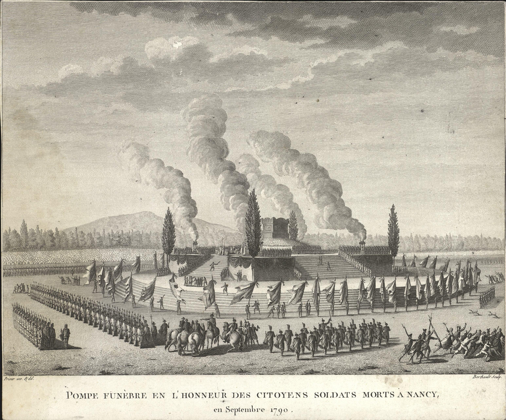 - opschrift midden onder afbeelding: POMPE FUNÈBRE EN L'HONNEUR DES CITOYENS SOLDATS MORTS A NANCY,/ en Septembre 1790.