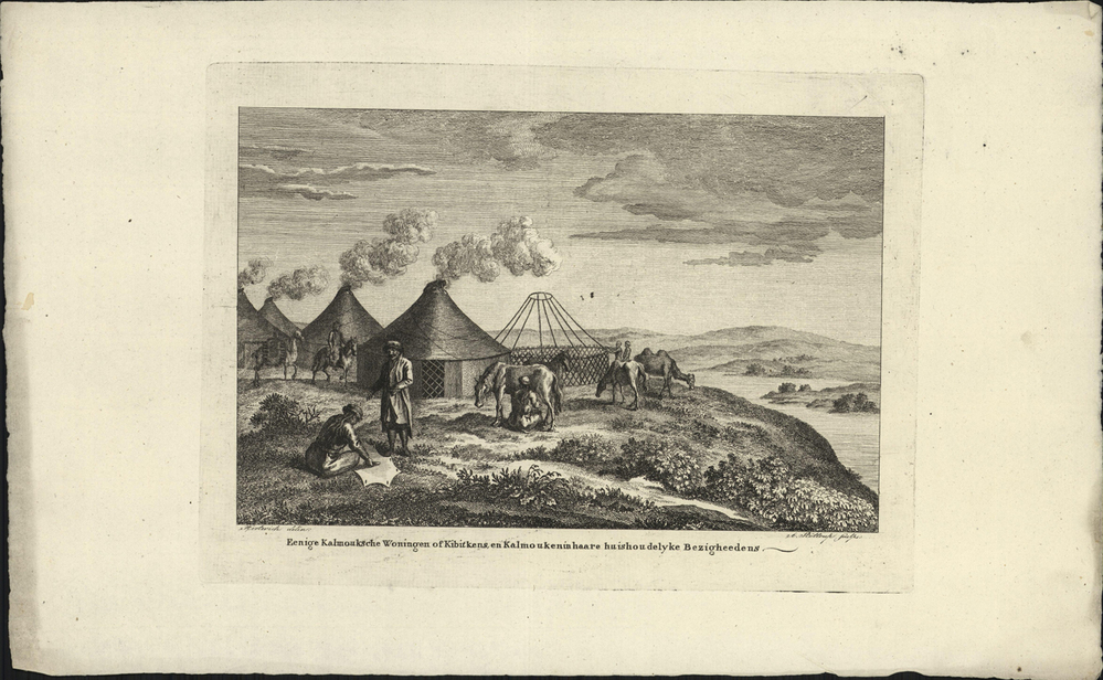 - opschrift midden onder de afbeelding: Eenige Kalmouksche Woningen of Kibitkens, en Kalmouken in haare huishoudelyke Bezigheedens.