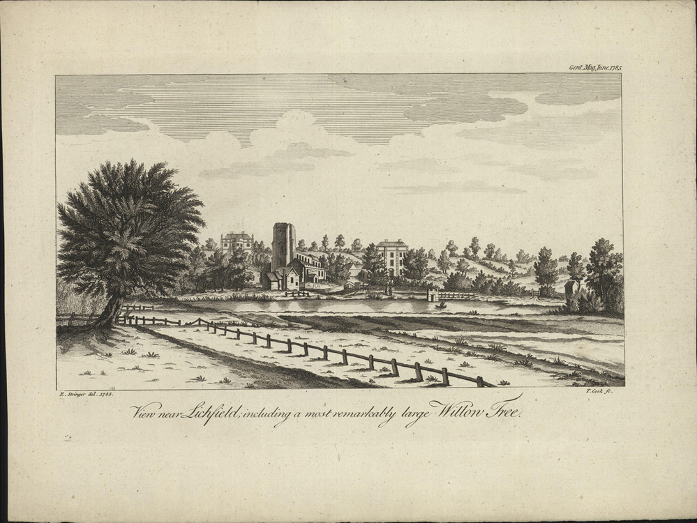 - opschrift midden onder afbeelding: View near Lichfield; including a most remarkably large Willow Tree.