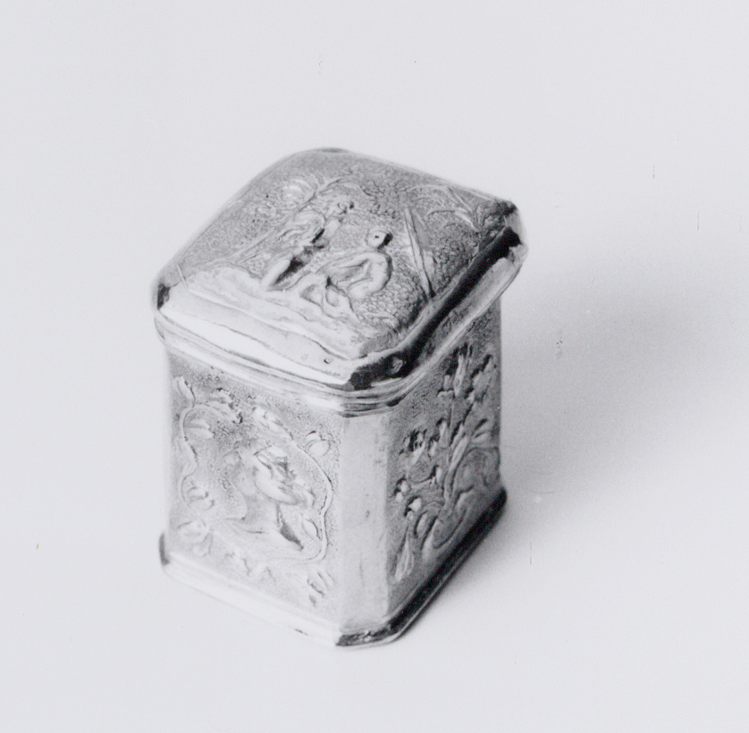 Rechthoekige doos met afgeschuinde hoeken en scharnierend deksel. Profielrand langs onderrand doos en deksel. Reliëfdecors op een geruwde ondergrond. Op deksel een voorstelling van twee oosterse figuren met parasol. Wanden met twee voorstellingen van vrouwenbustes, alternerend met twee bloemtakken. Op achterwand is: 1843/ gegrift, op bodem: MI/ en: 260/.