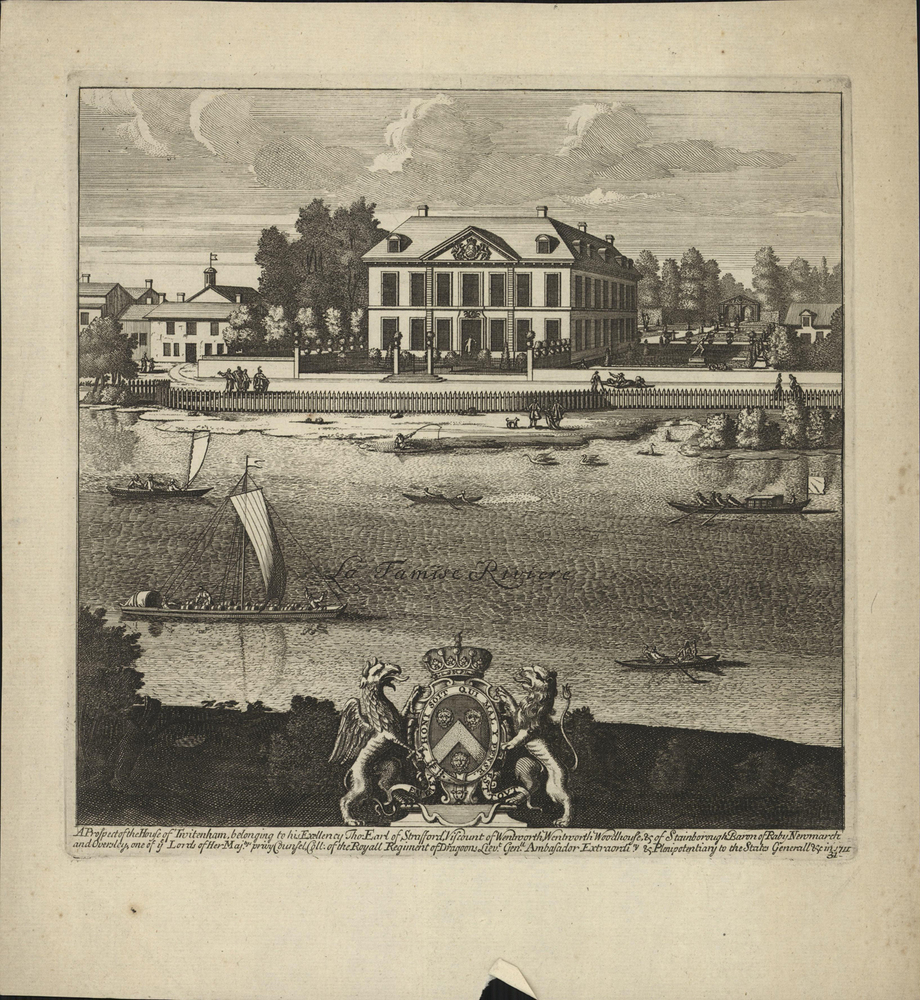 opschrift onder afbeelding: A Prospect of the House of [...]itenham, belonging to his Excellency Tho. Earl of Stafford, Viscount of Wentworth, Wentworth Woodhouse, & of Stainborough Baron of Raby Newmarch/ and Oversley, one of ye Lords of Her Maj.tys privy Counse, Coll: of the Royall Regiment of Dragoons Lieut. Genll. Ambasador Extraordi.ry & Plenipotentiary to the States Generall &c in 1711/ 31
