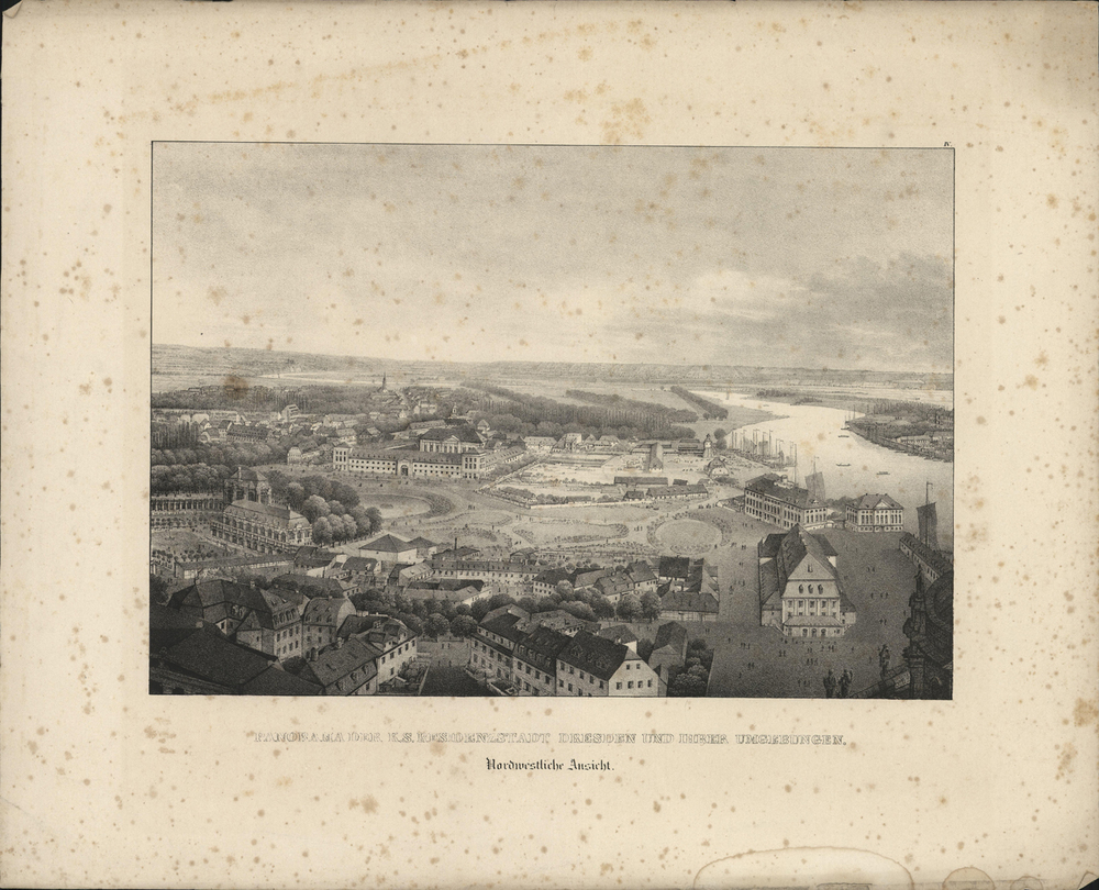 - opschrift midden onder afbeelding: PANORAMA DER K.S. RESIDENZSTADT DRESDEN UND IHRER UMGEBUNGEN.