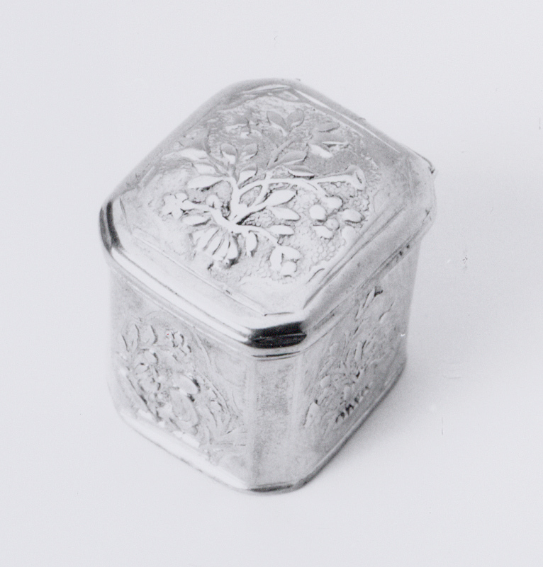 Dit achthoekige loddereindoosje is het vroegst gedateerde Amsterdamse exemplaar in de verzameling van het Amsterdams Historisch Museum. Een loddereindoosje is een klein, hoog doosje, dat een sponsje bevatte, gedrenkt in reukvloeistof. De naam lodderein is een verbastering van de oorspronkelijke Franse benaming 'l'eau de la reine', koninginnewater. Het gebruik van dit reukwater kwam tegen het midden van de achttiende eeuw in zwang en bleef ongeveer een eeuw in gebruik. Zilveren loddereindoosjes hebben veelal gegraveerde, gedreven of gestampte voorstellingen, al dan niet geciseleerd of op een andere wijze nabewerkt. Met name de stampwerktechniek maakte een seriematige productie van dozen of onderdelen ervan mogelijk. Opmerkelijk is dat er veel identieke decors voorkomen. Mallen voor stampwerk werden dan ook gedurende langere tijd gebruikt en veelvuldig door zilversmeden onderling uitgeleend.